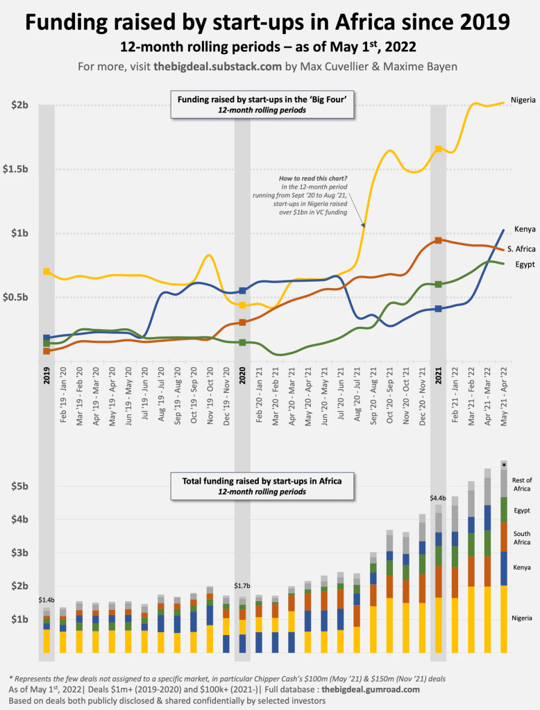 And what does it tell us? At an overall ecosystem level, the inflection point happened in mid 2021, driven mostly by Nigeria’s performance. Start-ups in Nigeria are now raising more ‘annually’ than the whole ecosystem was just a year ago. Until mid-2021, Kenya and South Africa could challenge Nigeria’s dominance. As a matter of fact, there is a 5-month period in late 2020/early 2021 when Kenya was outperforming Nigeria. For the Mar ‘20 – Feb ‘21 period, South Africa was even also close to outclassing Nigeria. Since mid-2021 though, the gap is now quite substantial between Nigeria and its runner-up. Finally, we will keep an eye in the coming months on the recent flattening of the Nigerian curve and more notably on the now 4 consecutive months of decline of the South African one…