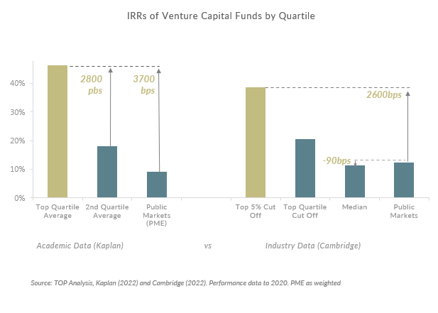 For example, the Kaplan studies show that top-quartile Venture managers generated a 46% IRR – that is, 2,800bps better than the average of the 2nd quartile managers, and 3,700bps better (or 5x higher) than the public comparable. Similarly, the CA data shows that top-quartile and top-5% VC funds outperformed public markets annually by at least 800bps, and 2,600bps respectively, where median VC funds underperformed by around 90bps.